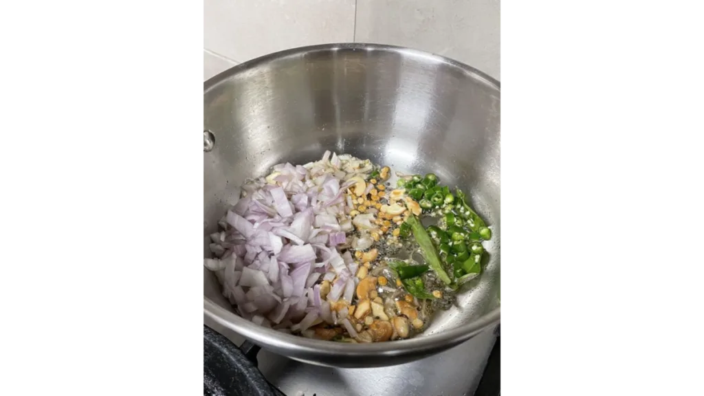 Step-2: Heat oil in a pan, add mustard seeds, when it splutters, add onion, ginger, garlic, green chillies and curry leaves. Add 2 cups of water and let it boil.